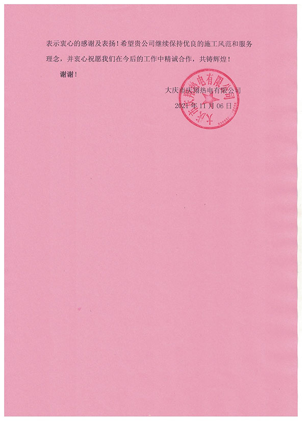業(yè)主單位對迪爾人的辛勤付出表示肯定并發(fā)來表揚信。