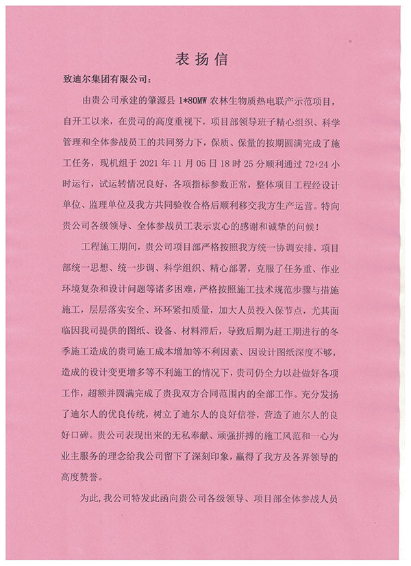 肇源縣1×80MW生物質(zhì)熱電聯(lián)產(chǎn)示范項目業(yè)主表揚信