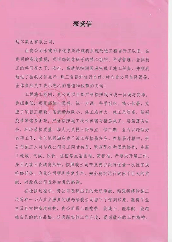 中化泉州給煤機(jī)系統(tǒng)改造項(xiàng)目表?yè)P(yáng)信