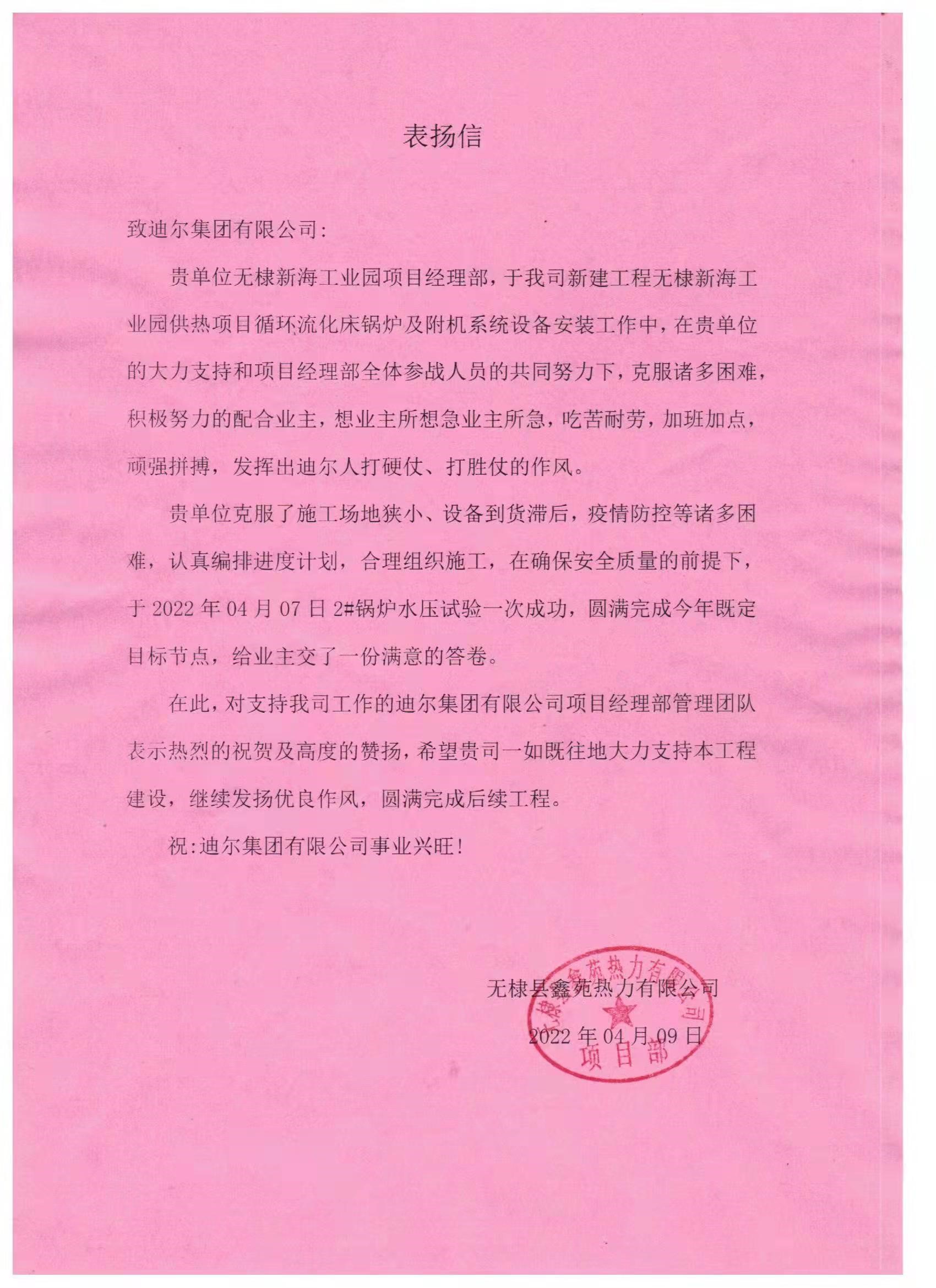 由迪爾集團(tuán)有限公司濟(jì)南分公司承建的無(wú)棣新海工業(yè)園供熱項(xiàng)目循環(huán)流化床鍋爐及附機(jī)系統(tǒng)設(shè)備安裝工程,2#鍋爐于2022年4月7日上午11時(shí)50分水壓試驗(yàn)一次成功,獲得業(yè)主單位的一致好評(píng)。