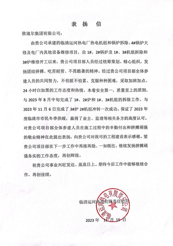 臨清運河熱電2#機(jī)組沖轉(zhuǎn)一次成功表揚信