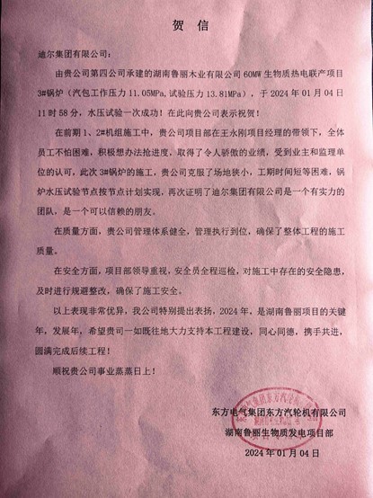 2024年1月4日11時58分,第四公司魯麗木業(yè)有限公司60MW生物質(zhì)熱電聯(lián)產(chǎn)項目部3#鍋爐水壓試驗一次成功,為2014年度工作開了一個好頭。