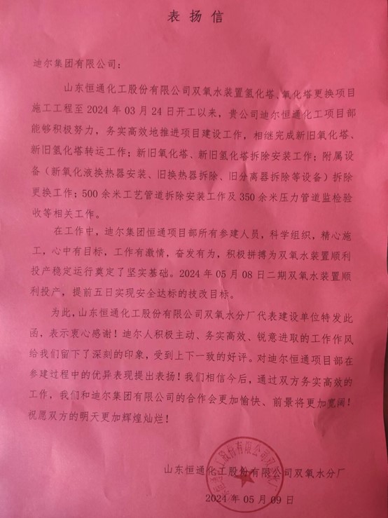 為此,山東恒通化工股份有限公司雙氧水分廠代表建設(shè)單位特發(fā)此函,表示衷心感謝!迪爾人積極主動、務(wù)實高效、銳意進取的工作作風給我們留下了深刻的印象,受到上下一致的好評。對迪爾恒通項目部在參建過程中的優(yōu)異表現(xiàn)提出表揚!我們相信今后,通過雙方務(wù)實高效的工作,我們和迪爾集團有限公司的合作會更加愉快、前景將更加寬闊!祝愿雙方的明天更加輝煌燦爛!