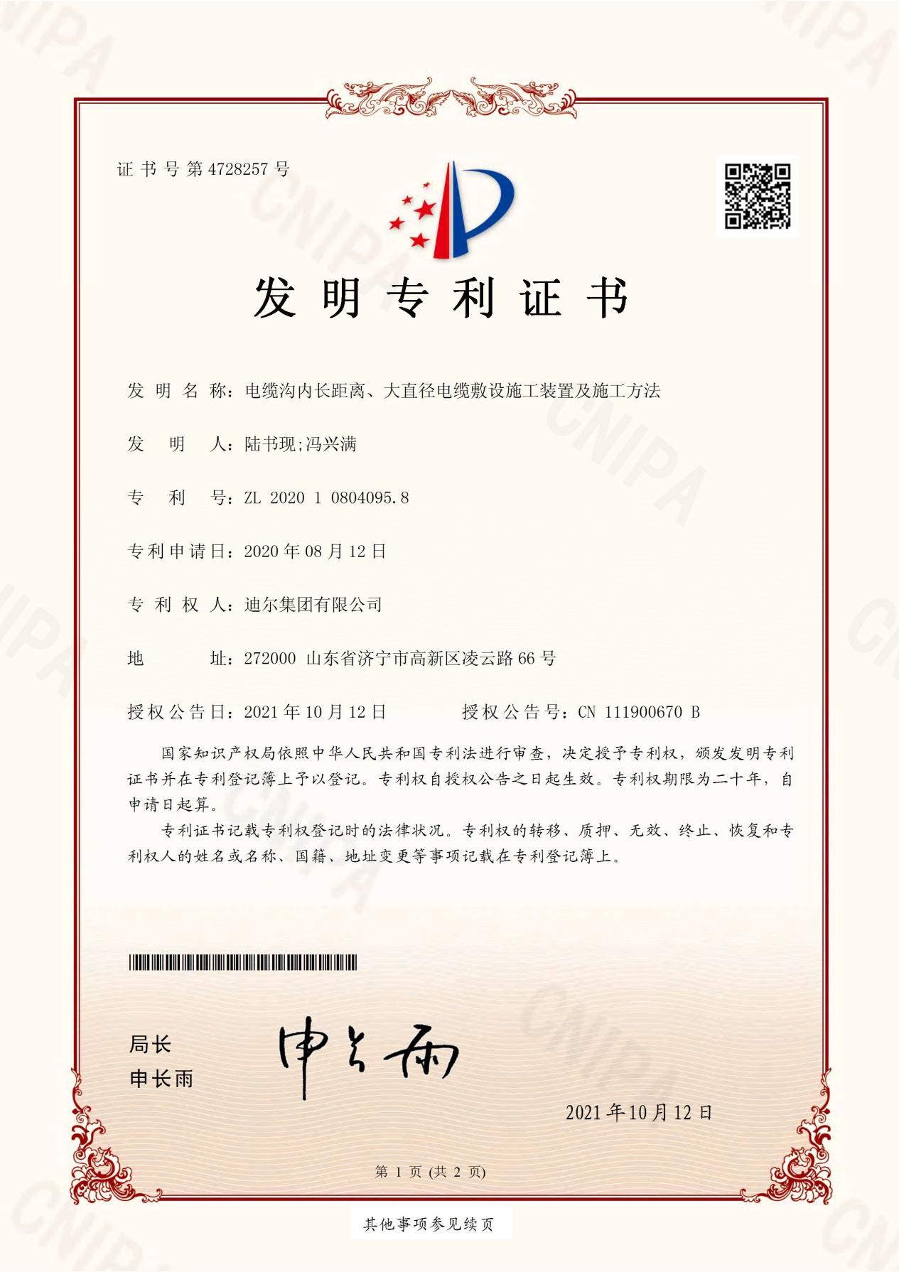 公司榮獲“電纜溝內(nèi)長距離、大直徑電纜敷設(shè)施工裝置及施工方法”發(fā)明專利