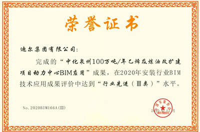 迪爾集團有限公司選送的《中化泉州100萬噸/年乙烯及煉油改擴建項目動力中心BIM應(yīng)用》成果,獲得2020年安裝行業(yè)BIM技術(shù)應(yīng)用行業(yè)先進(Ⅲ類)。