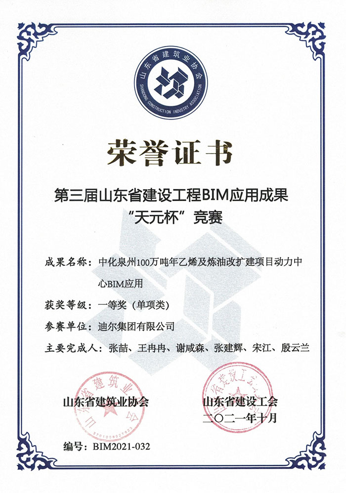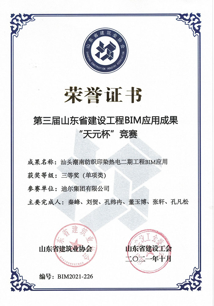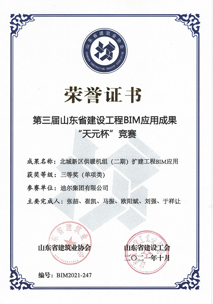 近日,山東省建筑業(yè)協(xié)會、山東省建設(shè)工會聯(lián)合發(fā)布了魯建協(xié)【2021】43號《關(guān)于公布第三屆山東省建設(shè)工程BIM應(yīng)用成果“天元杯”競賽獲獎名單的通知》。迪爾集團有限公司經(jīng)專家評審、終評答辯和公示等環(huán)節(jié),最終獲得一等獎1項、二等獎1項、三等獎3項的優(yōu)異成績。