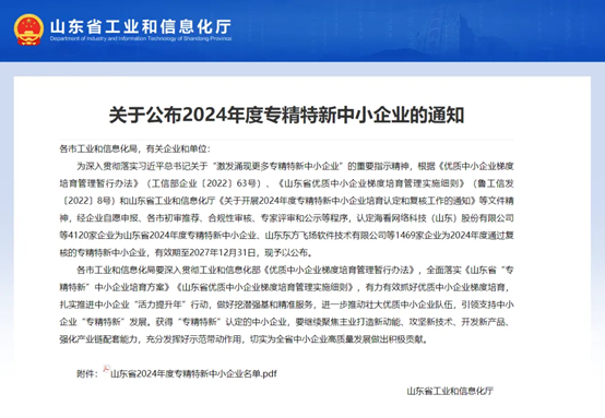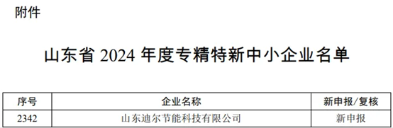 近日,山東省工業(yè)和信息化廳公布2024年度專精特新中小企業(yè),山東迪爾節(jié)能科技有限公司順利通過評(píng)審認(rèn)定。